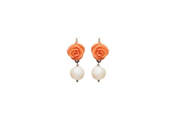 Small orange coral roses with freshwater pearls create a delicate and enchanting combination of beauty and grace. The small orange coral roses, crafted with intricate detail, exude a romantic and feminine allure. Paired with freshwater pearls, the earrings achieve a charming and elegant fusion.