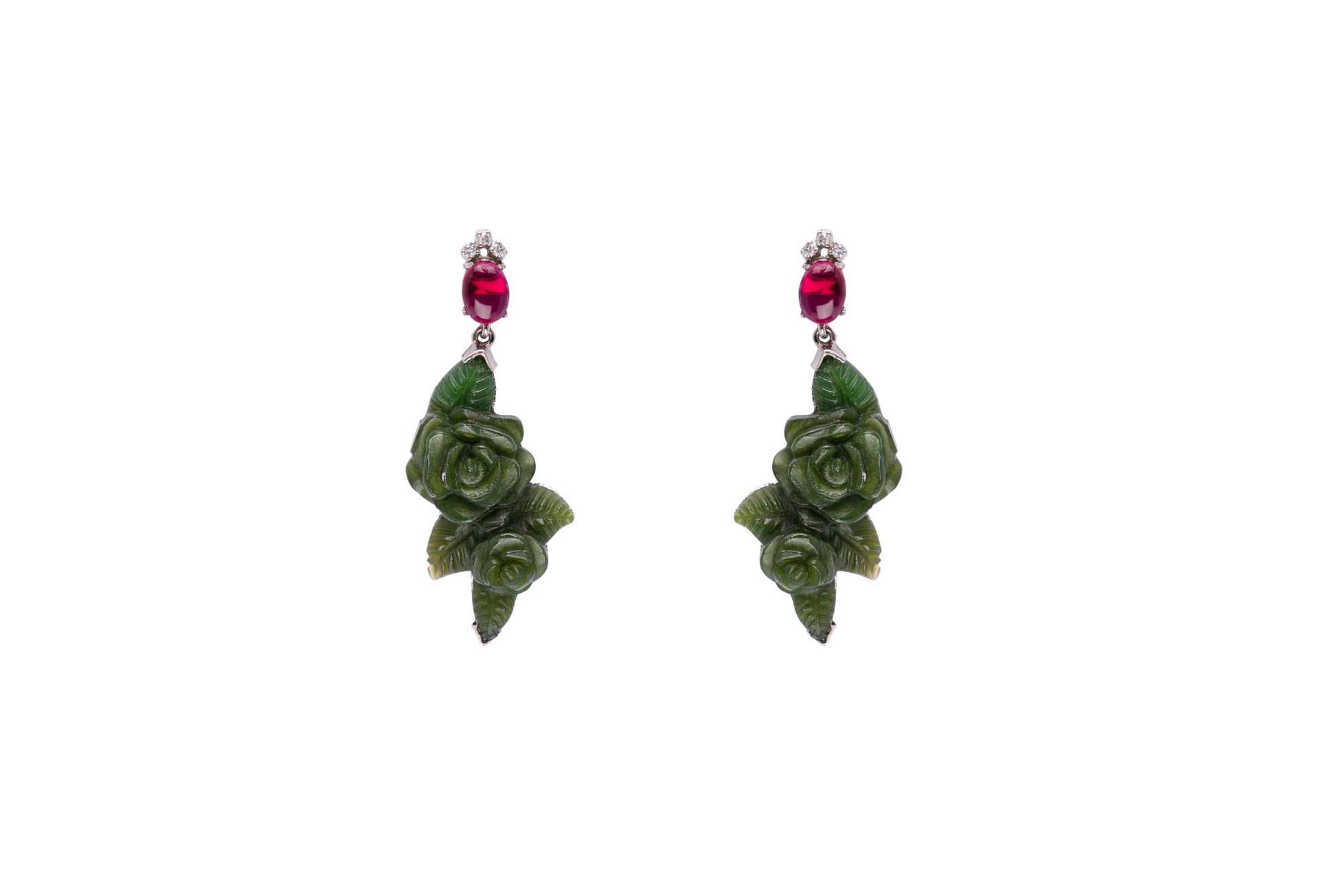 In these majestic earrings, jade has been masterfully carved into a bouquet of fresh roses and leaves, while real diamond and ruby add an unforgettable and timeless sparkle.¬â€
