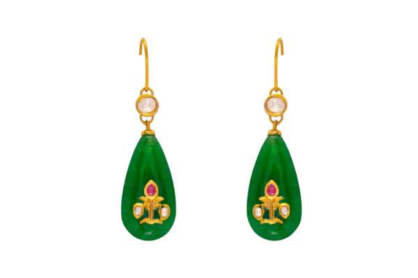 Their life-giving, fresh shade of green is the canvas for a breathtaking polki diamond design: three floral stems bursting at the centre of each onyx drop, singing a song of rich vitality. Their golden gleam is capped off by the central red bud, which is nothing less than genuine ruby. Because you deserve jewellery you can cherish for years to come.