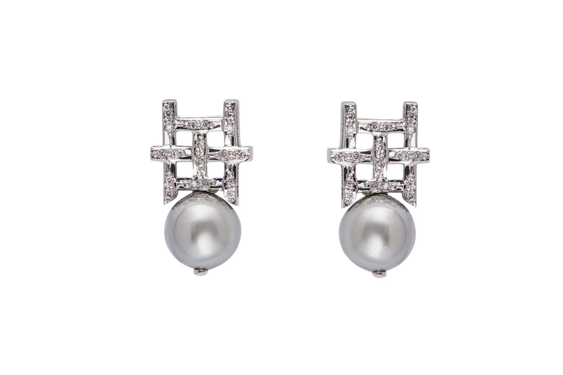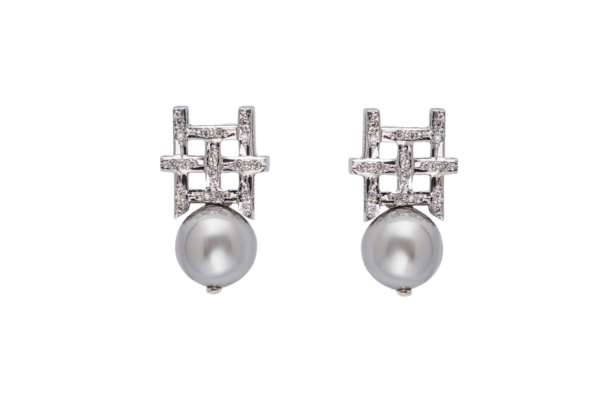 These stunning diamond-and-pearl earrings are just that: glorious works of art that celebrate differences. The upper half is a shimmering, 0.24 ct diamond-studded grid made of dynamic straight lines. The lower half is a singular, perfectly-rounded pearl with a smoky grey hue. This adds softness and mystery to the angularity of the glittering lines, completing these gorgeous items.¬†¬†¬â€