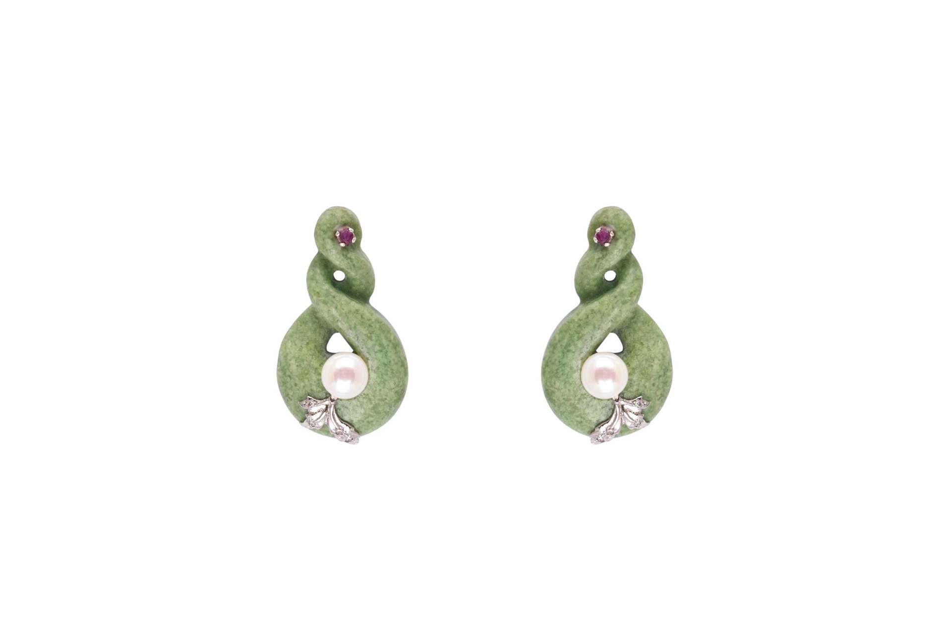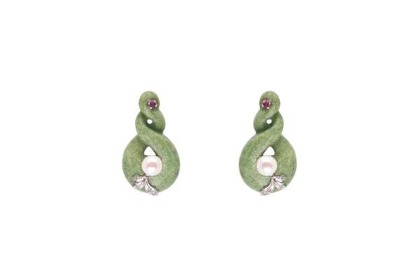 In these masterpieces, precious stone has been made to dance and intertwine as if it were made of supple fibers. But it’s not rope: it’s real idocrase stone that has been mastered by our artistic vision. A gentle pearl closes up the final loop, while luxury sits at either end of the twisting design: rich ruby radiating at the top and diamond-studded leaves glittering at the bottom. Whichever way you look, it’s altogether spellbinding.