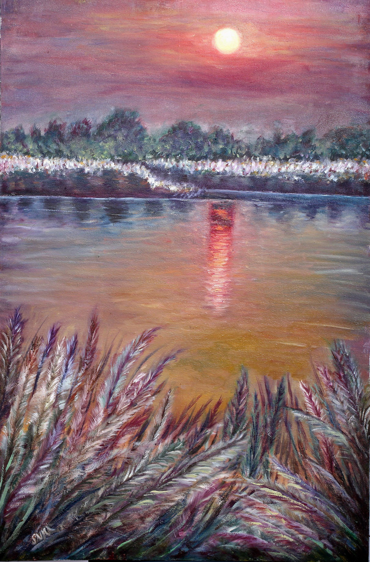 Winter sunsets hold a special place in the artist’s heart, and this passion shines through in “Winter’s Sunset Symphony.” The painting captures the essence of these enchanting moments with remarkable detail. At the forefront, feather-like tall grass, painted in shades of subdued green, maroon, and brown, delicately dances amidst hints of white. It’s a portrayal that whispers of the sun’s secret embrace, illuminating the grass spikes with a mesmerizing glow. This tranquil lakeside scene, bordered by muted green trees and grassy bushes touched by a soft white hue, creates a canvas where the blazing sun takes the spotlight against a backdrop of crimson and purplish skies. Its reflection upon the water’s surface adds an extra layer of serenity to this captivating winter vista.